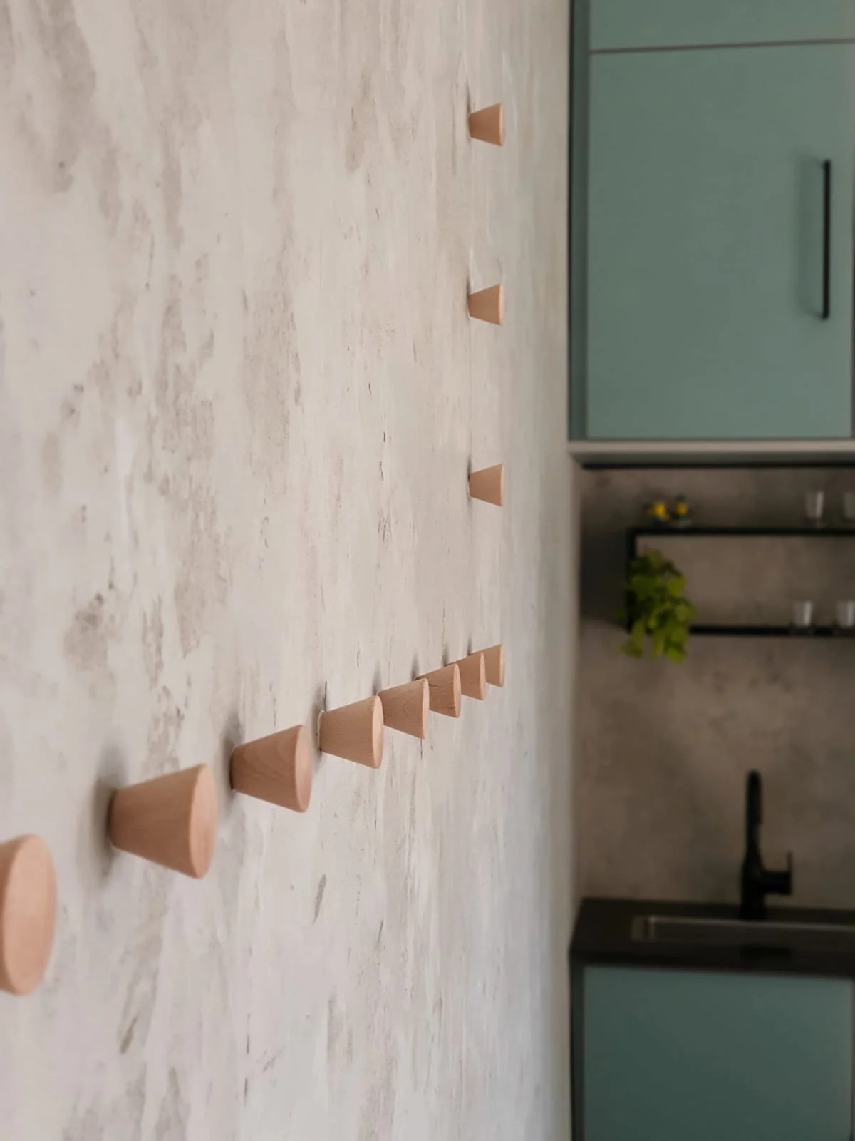 וקיר אחד שקיבל כפתורי עץ בשילוב תאורה שיוצרים ביחד מסלול