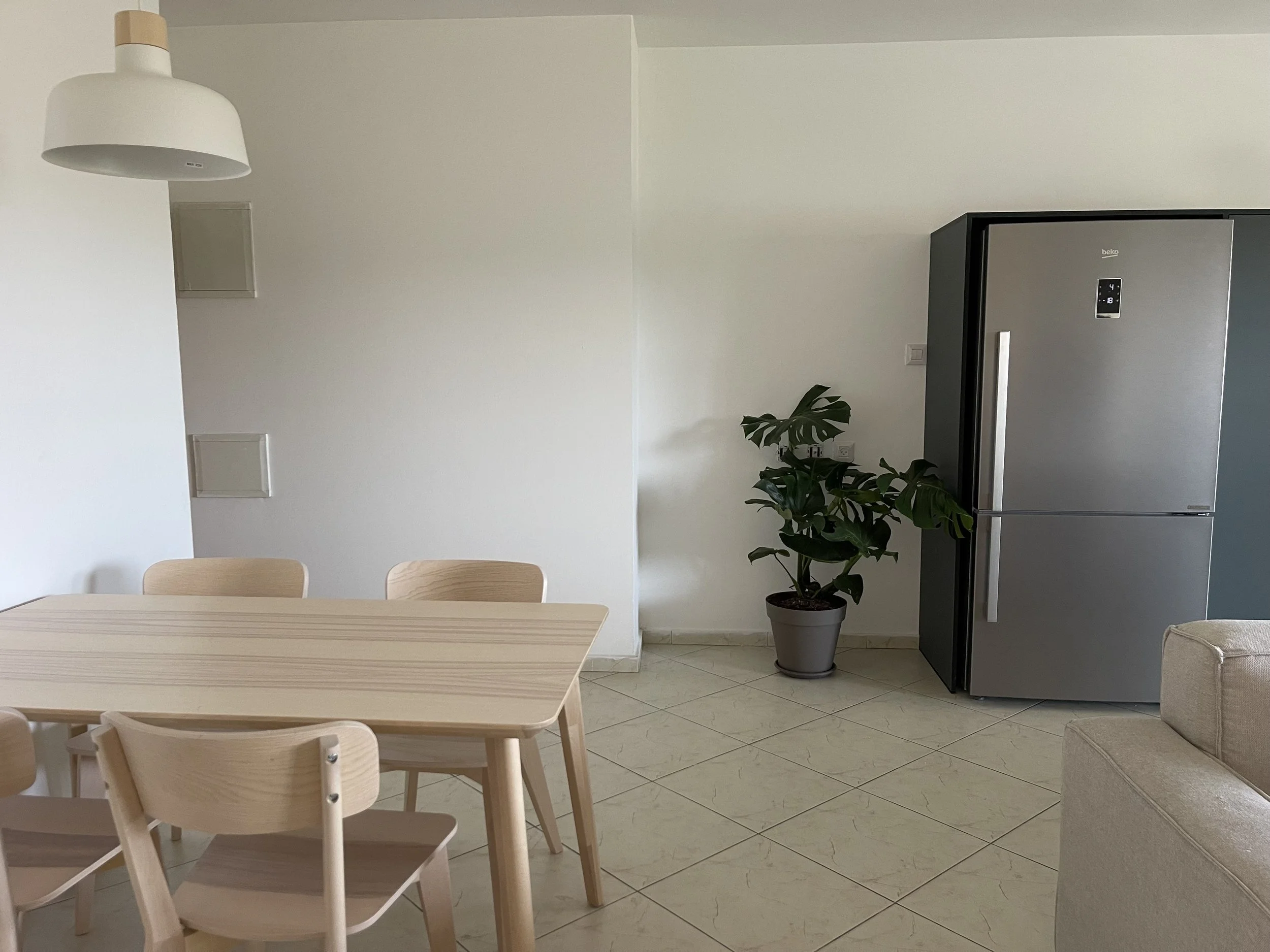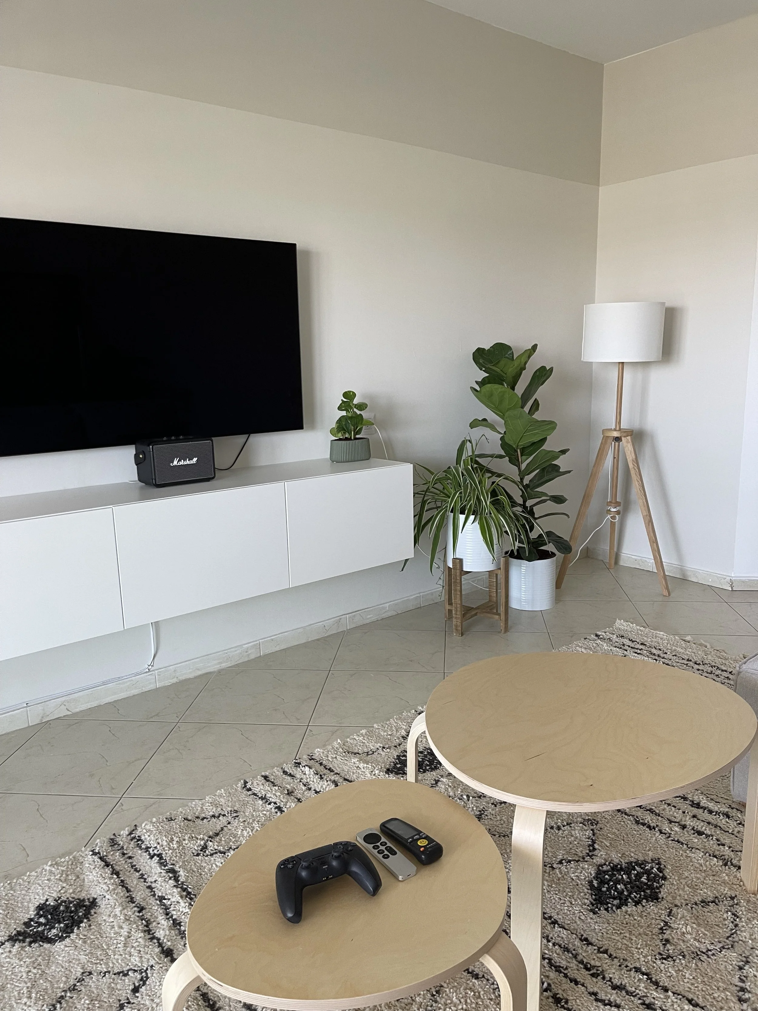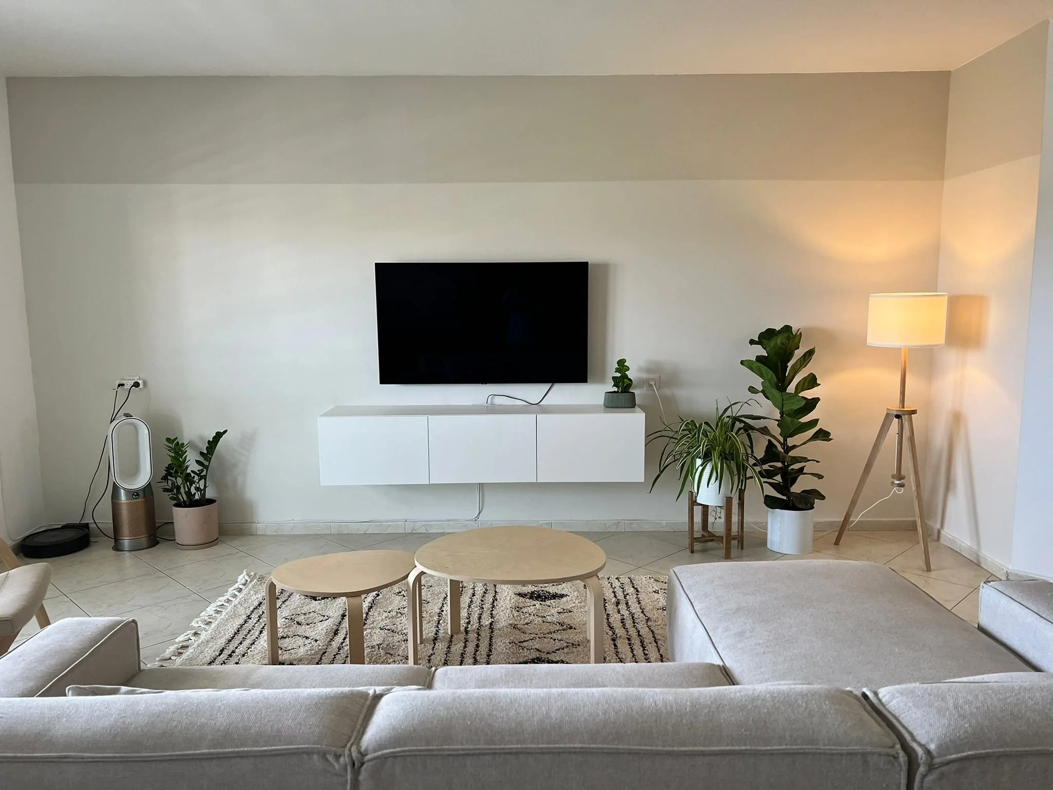 קיר הסלון קיבל משחק של שני גוונים טבעיים שהקפיצו את החלל.